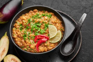 Baigan ka Bharta – A Smoky Delight with Poshnik’s Woodpressed Black Mustard Oil Rooted in Indian kitchens for generations, Baigan